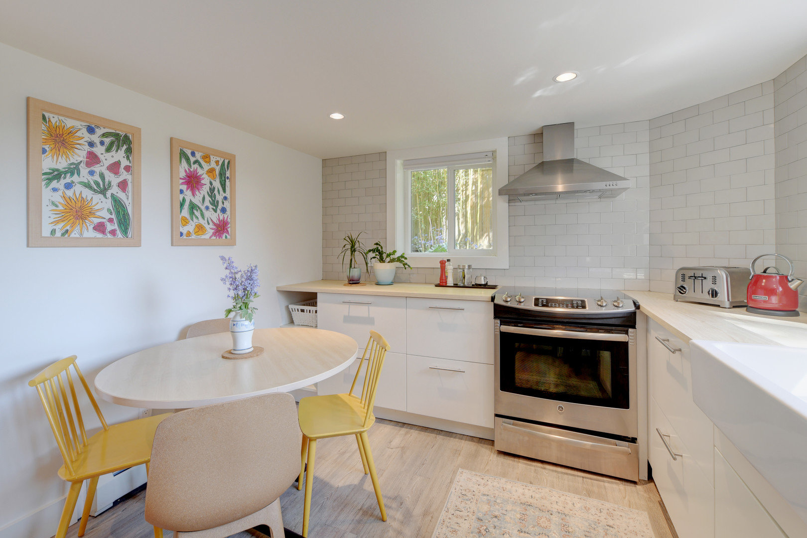 There are no ‘before’ pictures of this kitchen because it was that terrifying, the only thing we salvaged were the newish vinyl windows. Everything else had to be taken back to the studs and rebuilt! Because the ceilings are lower in this downstairs suite area we didn’t add any uppers or shelves, just beautiful counter to ceiling tile in a light green shade to help bring the garden views inside.